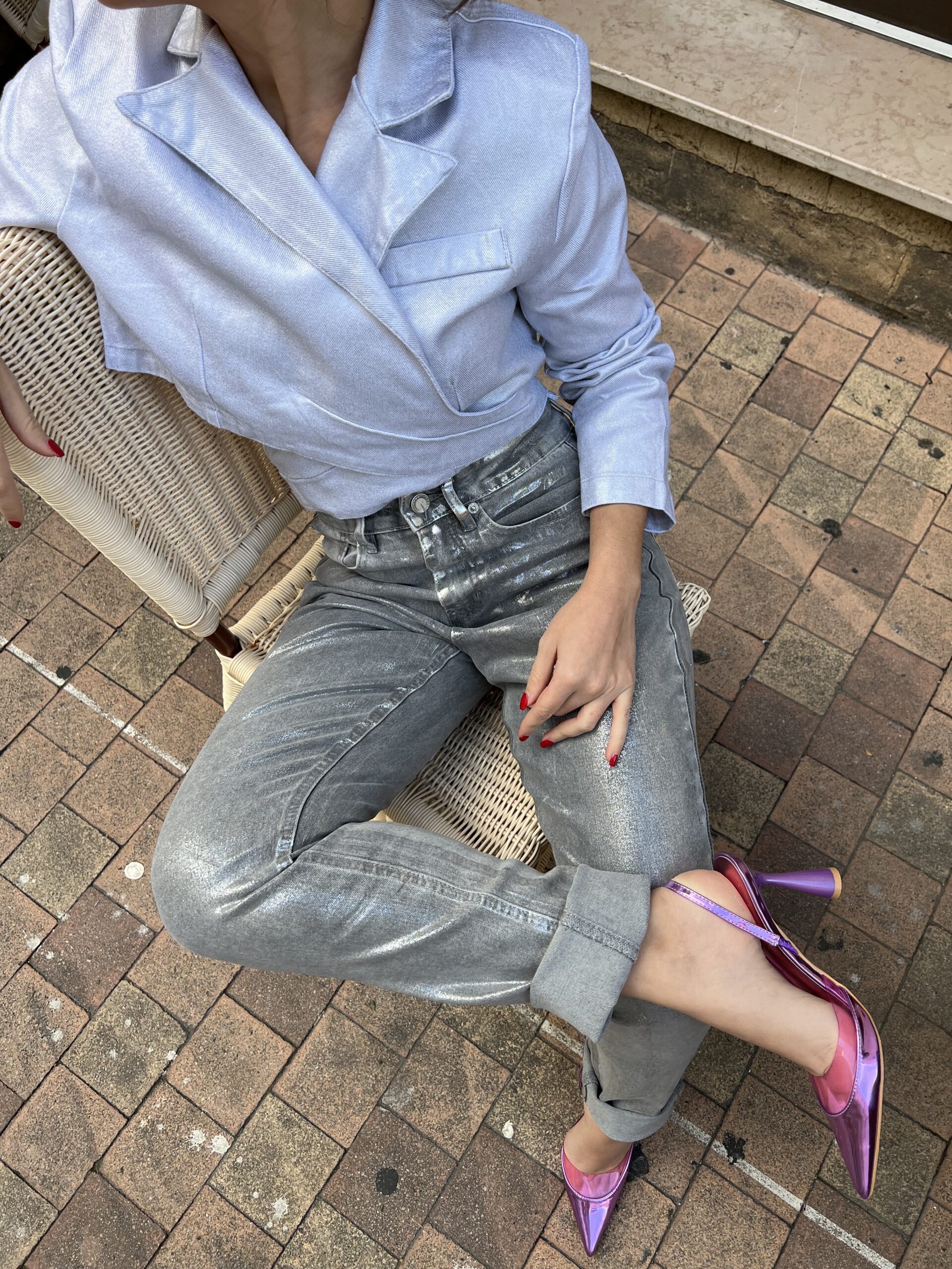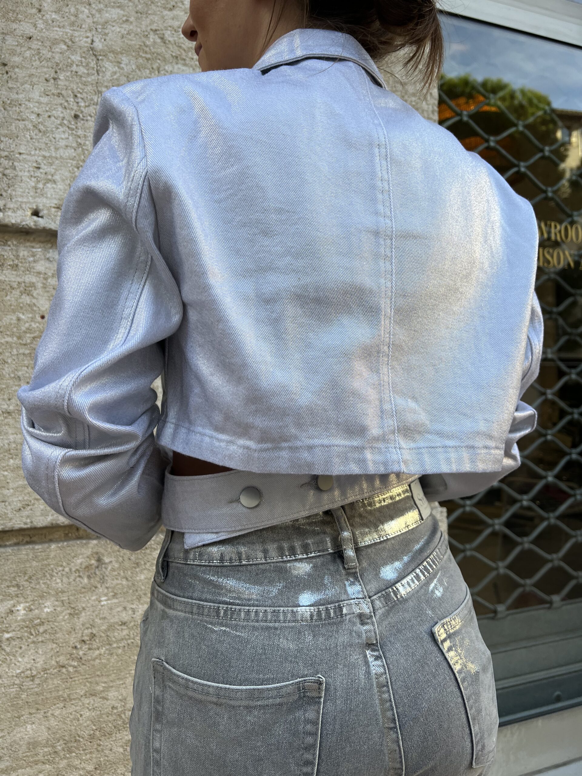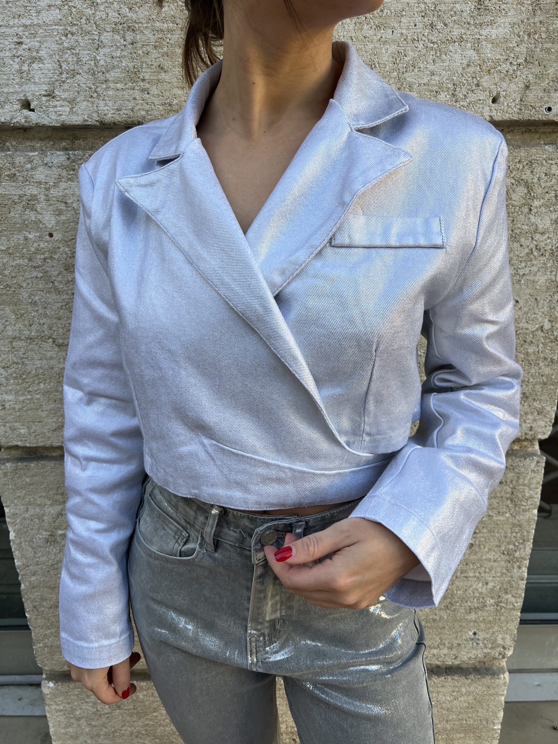 Un blazer crop croisé dans le dos, canon pour les fêtes que ce soit doré ou argenté, on vous laisse le choix