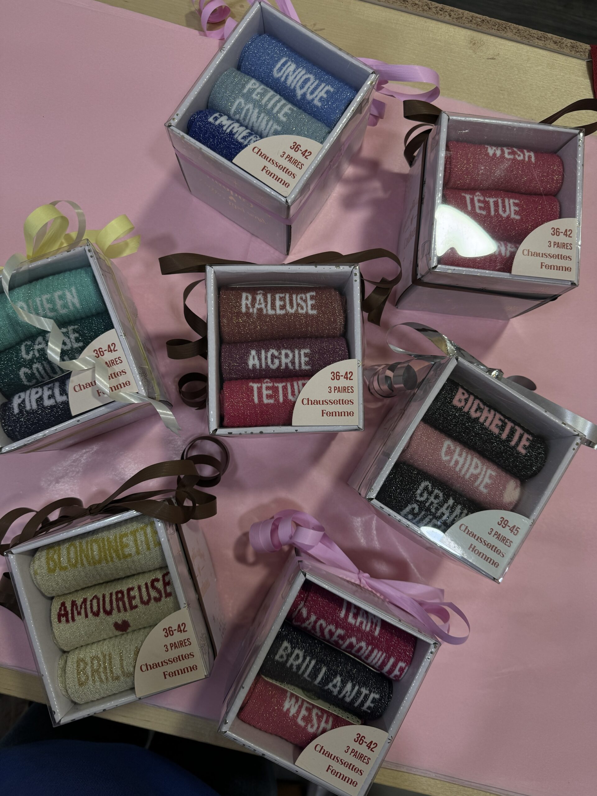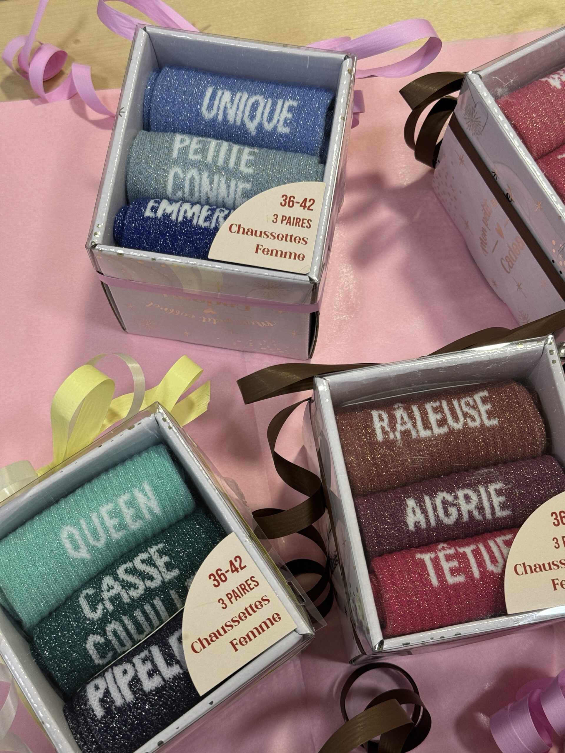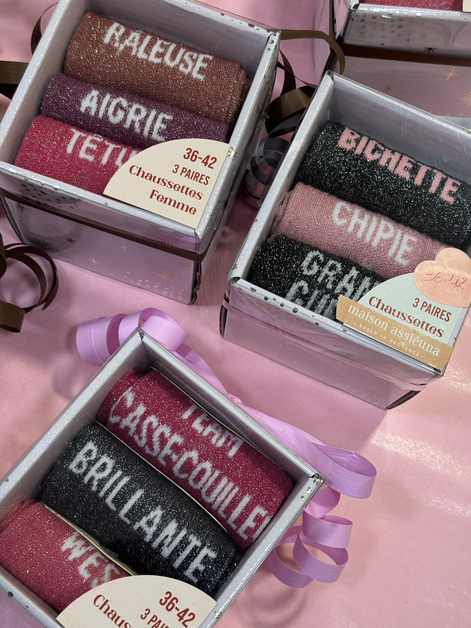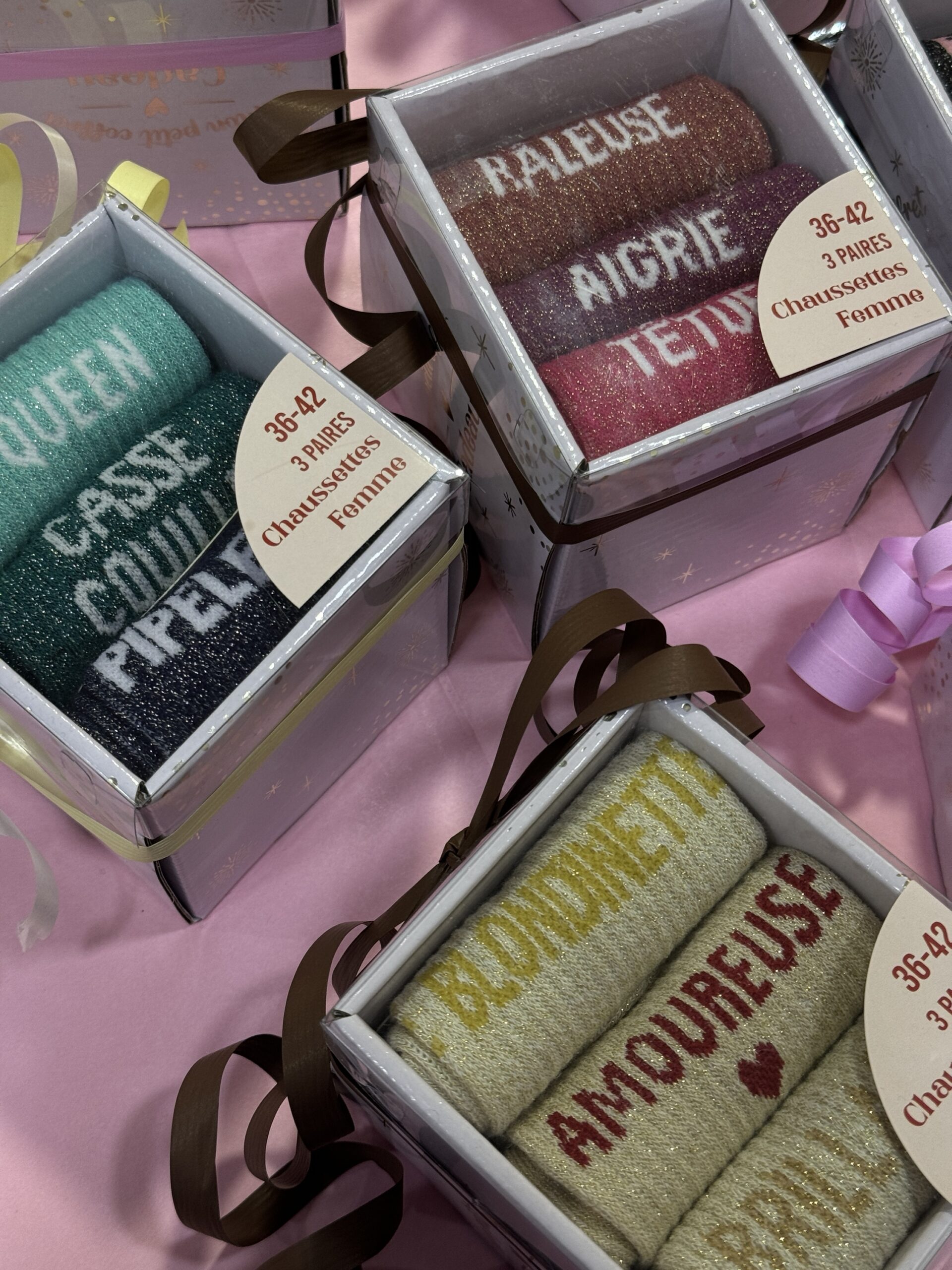 • Boxes de 3 chaussettes à paillettes avec message pour Elle et pour Lui ! Une super idée de cadeau à petit prix pour les fêtes