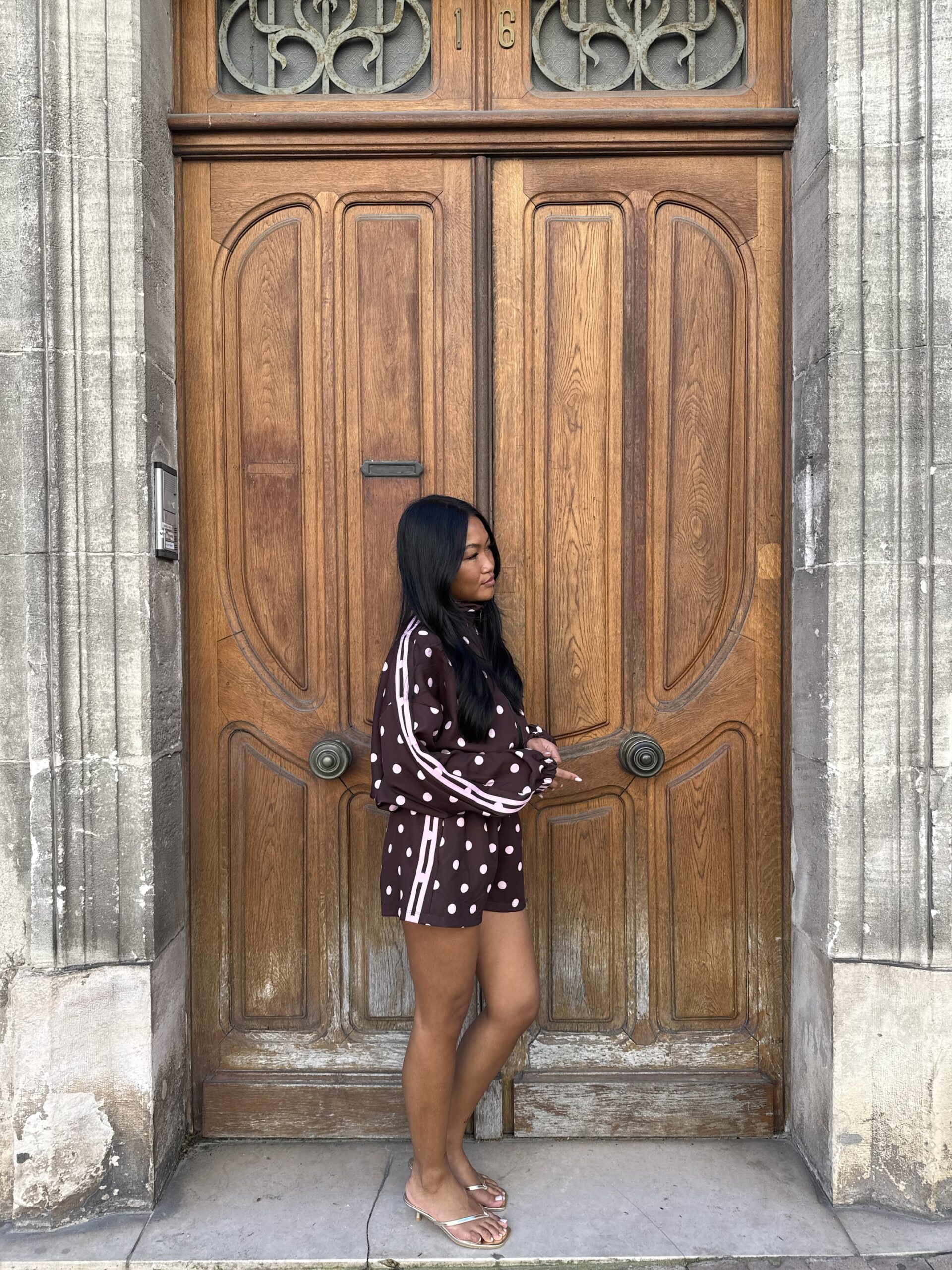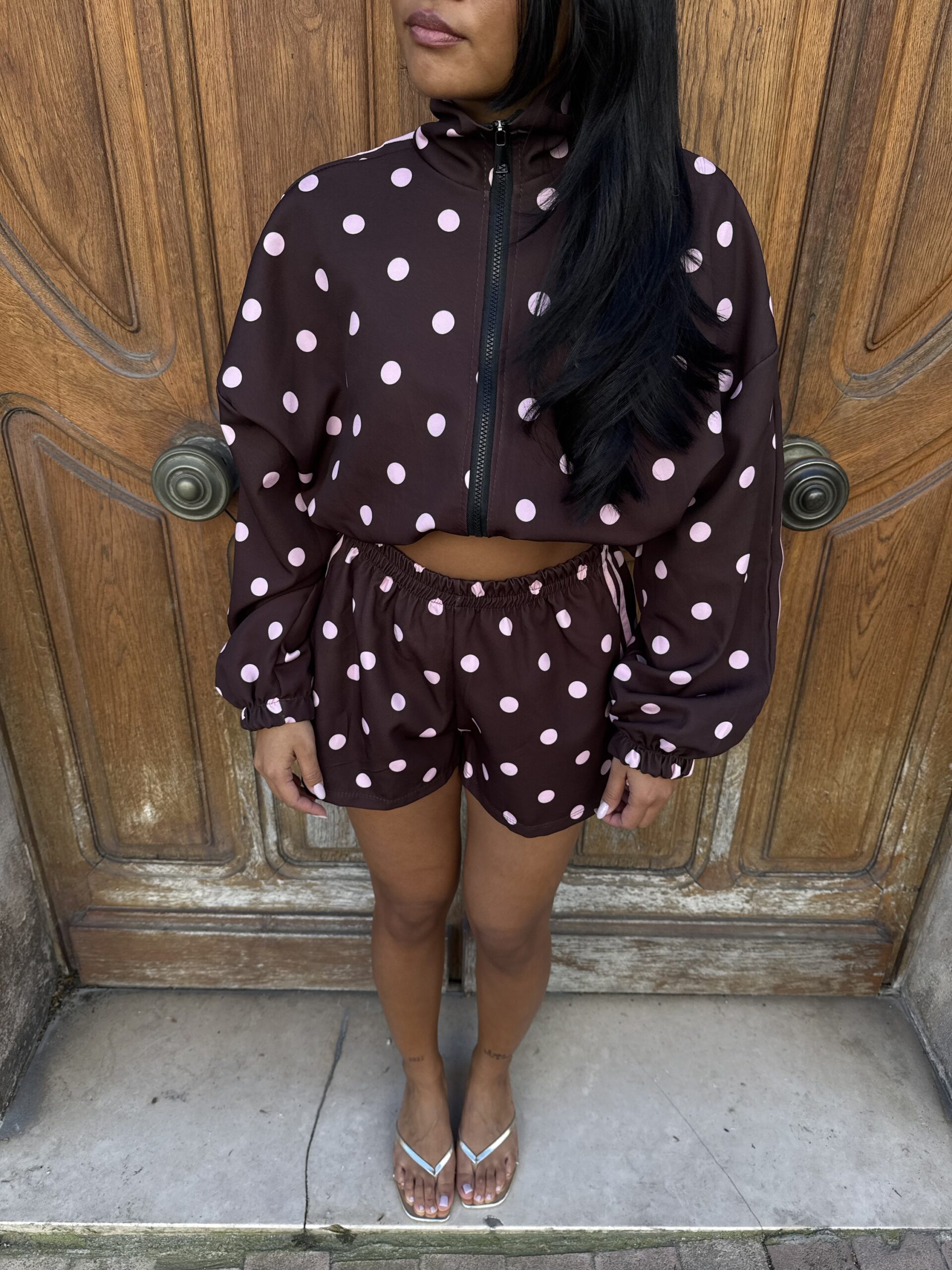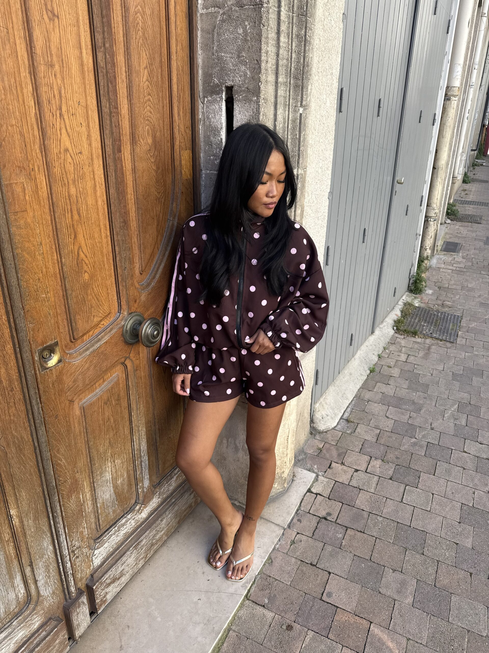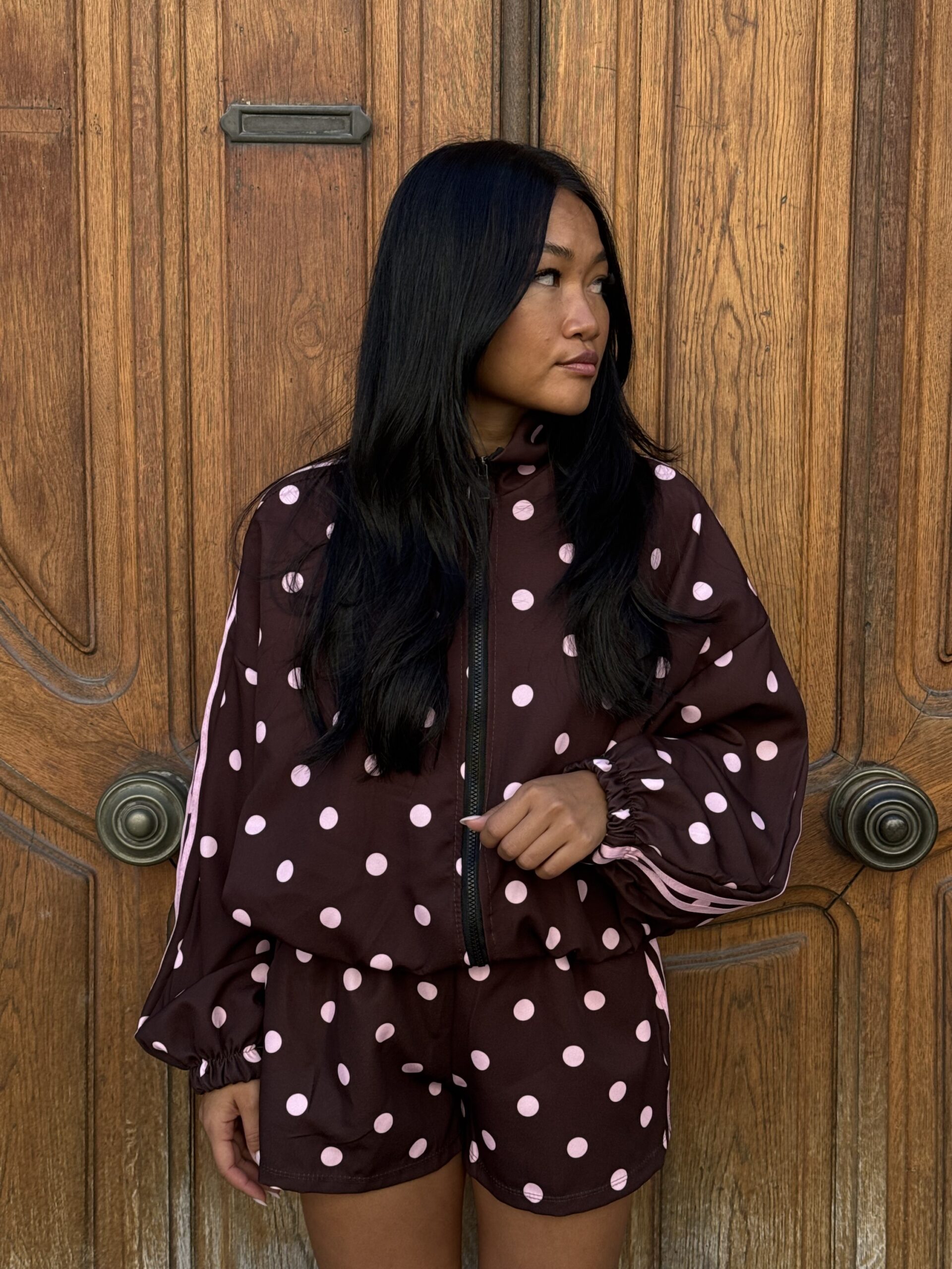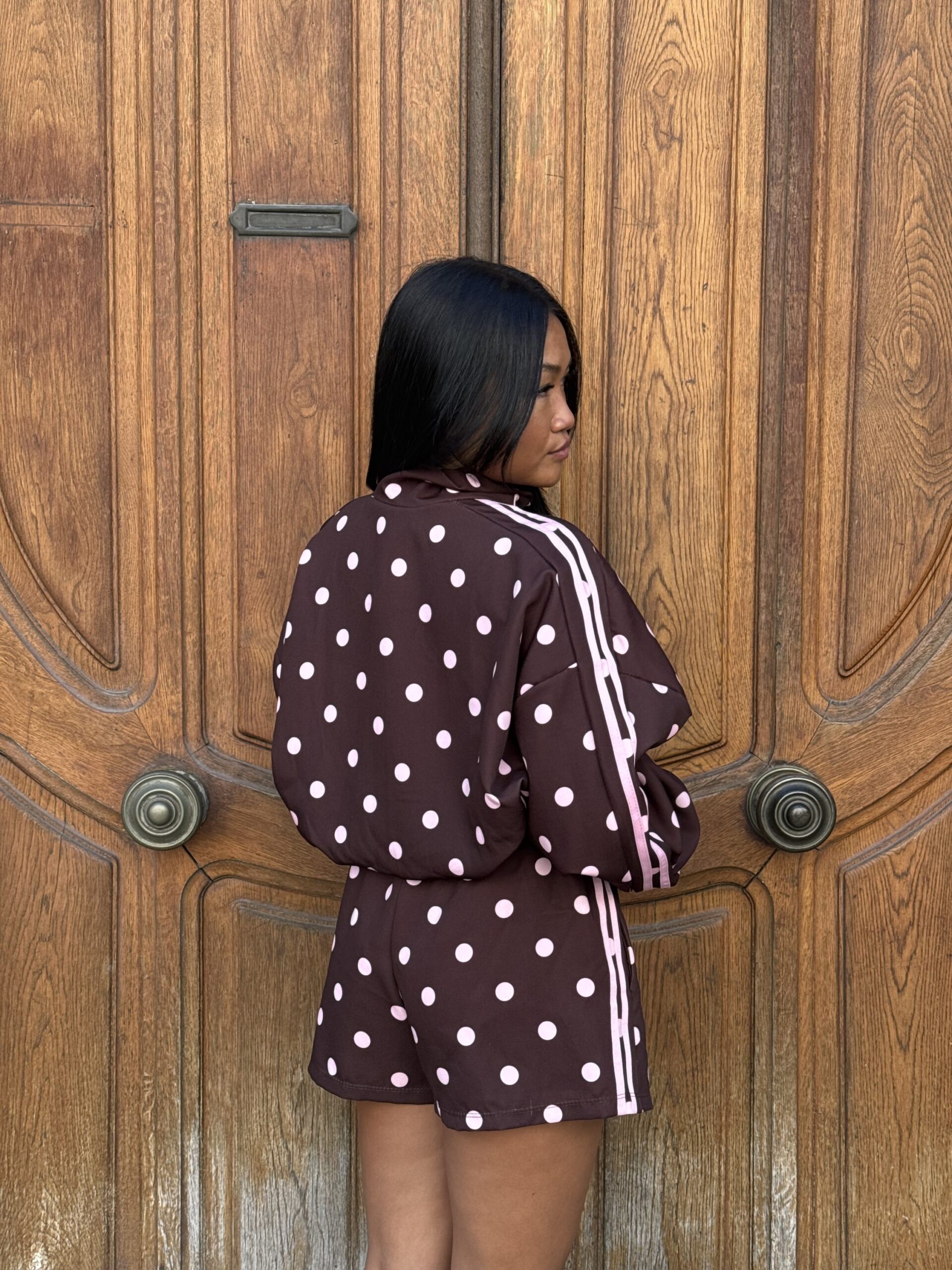 - Détails : imprimé pois et bandes roses sur la manche, poches sur la veste et le short, short avec élastique à la taille, bord côte sur la veste
