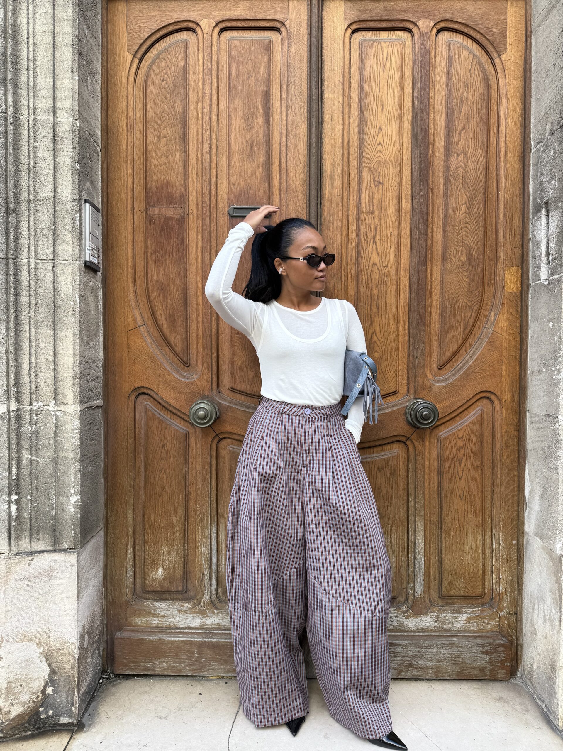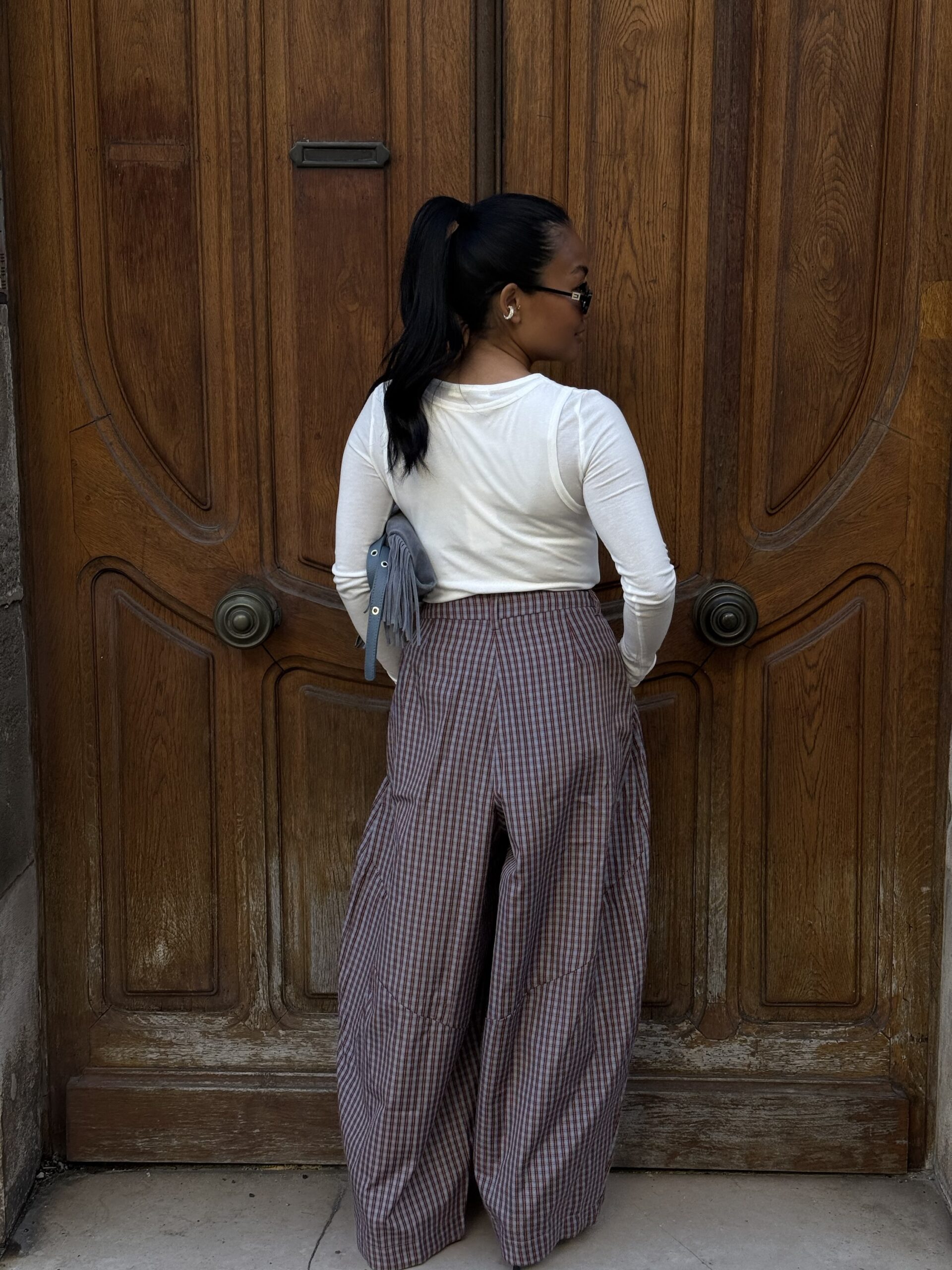 Pantalon à carreaux coupe balloon en 100 % coton, alliant confort et style tendance. Sa forme ample, légèrement resserrée en bas, structure la silhouette tout en offrant une grande liberté de mouvement. Doté d’une taille élastique pour un ajustement confortable, il se porte facilement au quotidien, aussi bien avec un top ajusté qu’une pièce plus oversize.