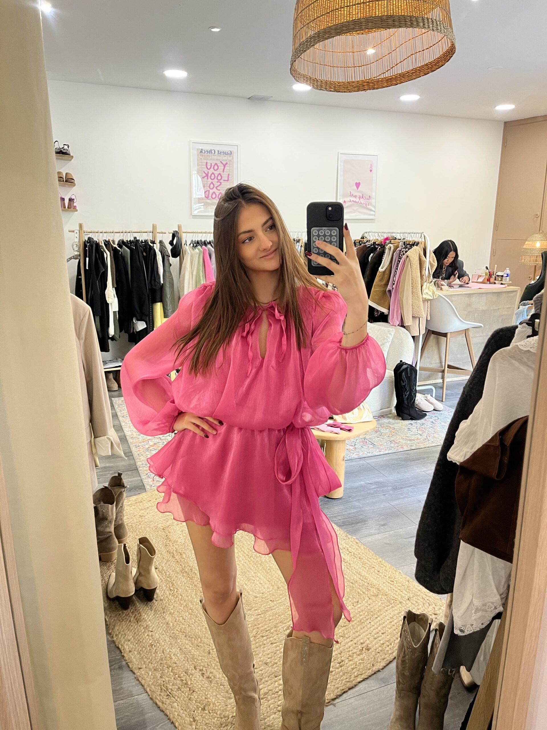 • Lili mesure 1m68 et porte une taille unique (fuchsia, blanc et noir)