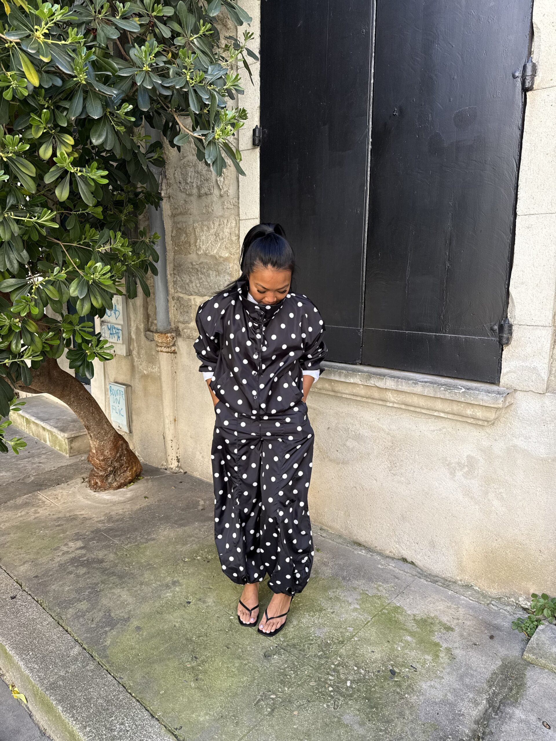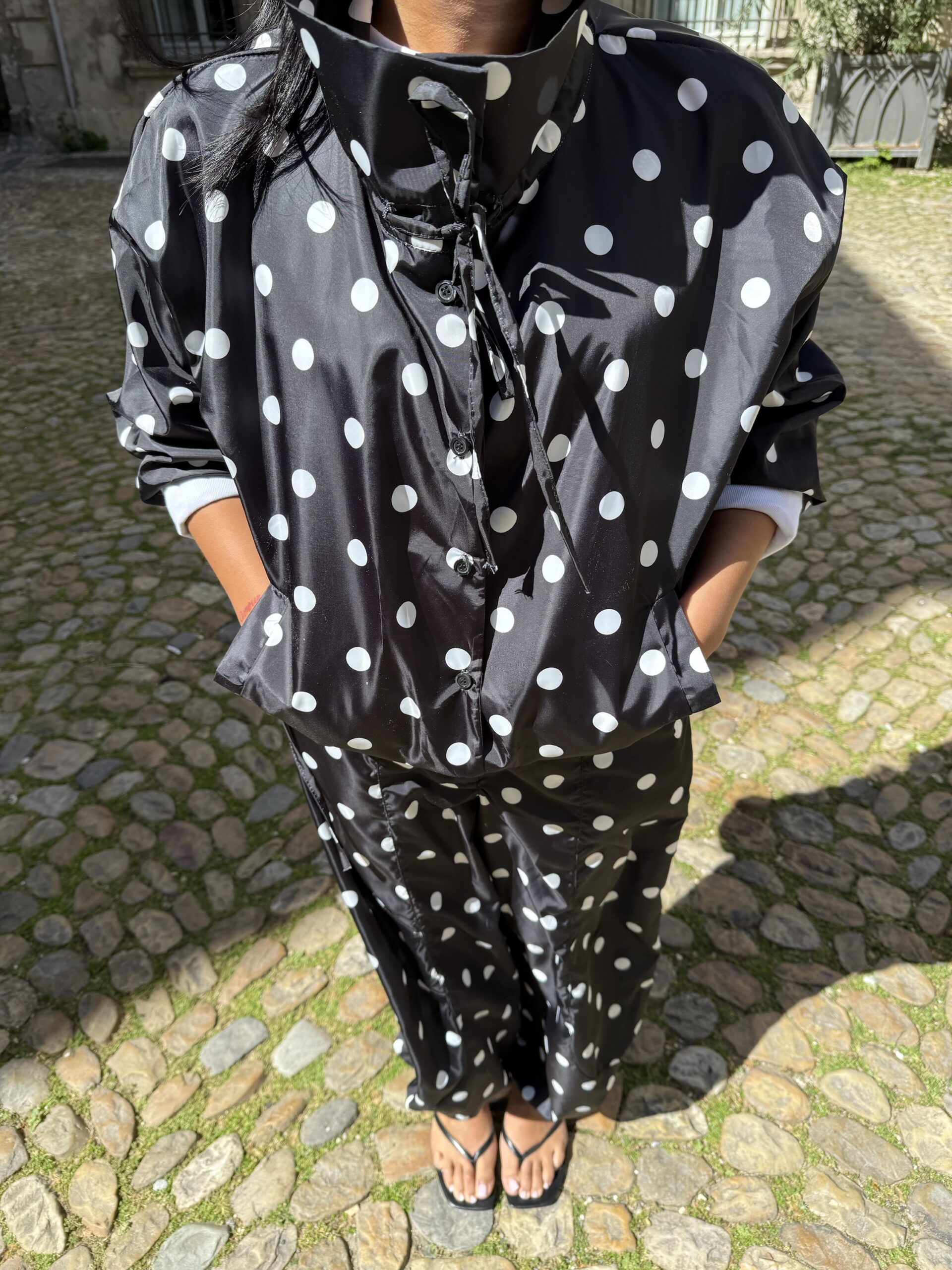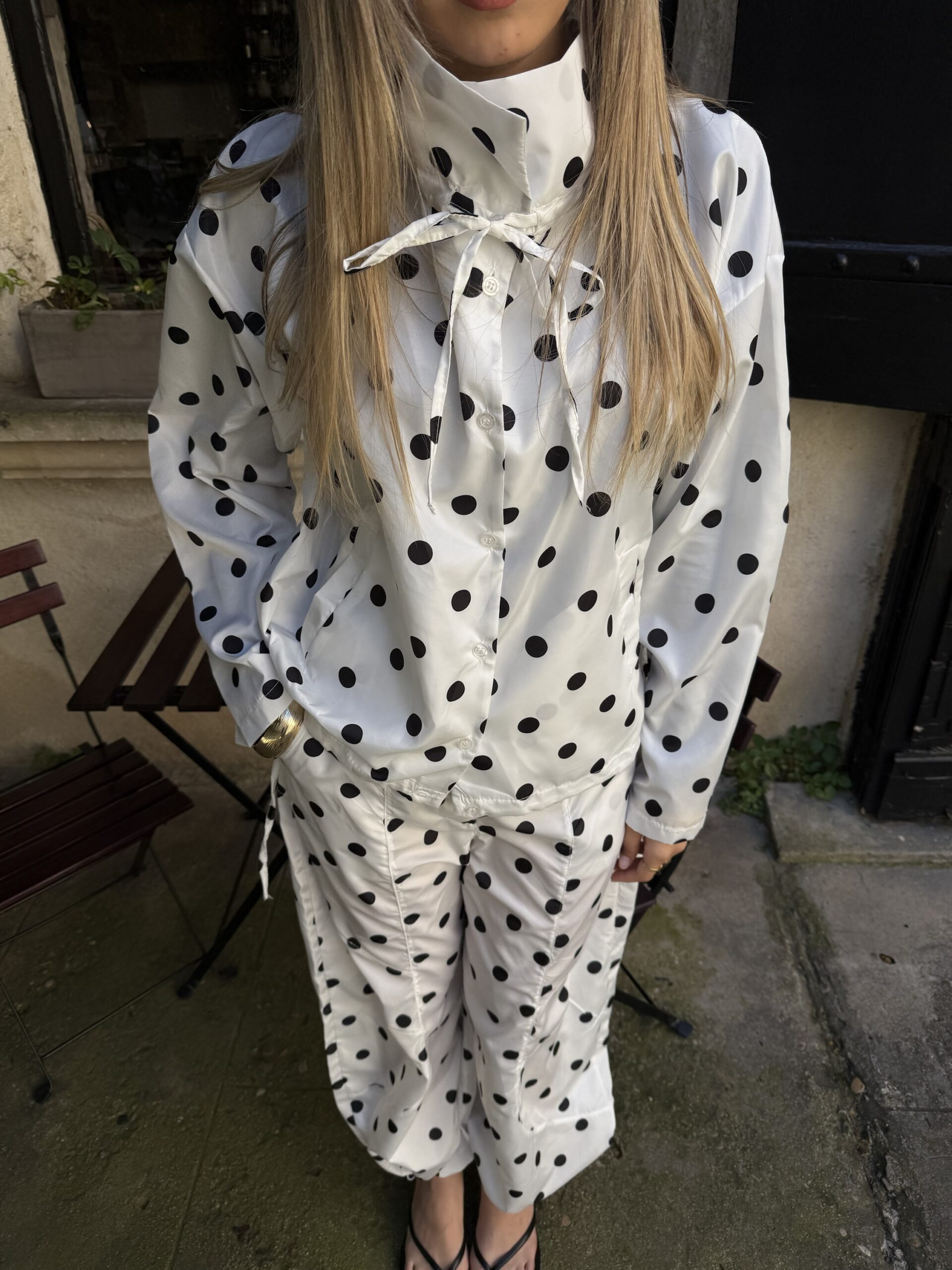 Disponible en blanc à pois noirs ou noir à pois blancs, elle s’adapte à toutes vos envies. Sa coupe modulable permet de la resserrer en bas pour un effet blousant, tout en étant ajustable en haut pour un tombé personnalisé.